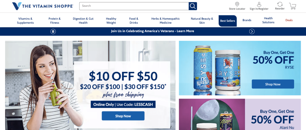 The Vitamin Shoppe vende una amplia gama de suplementos nutricionales, vitaminas y minerales. Además de su tienda en línea, la compañía tiene una aplicación dedicada y más de 700 tiendas físicas en todo Estados Unidos. También vende productos de belleza naturales, superalimentos y más.