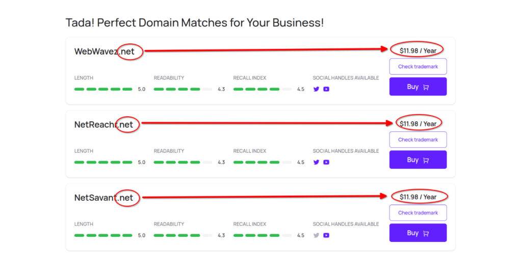 No sólo puede ayudarle a encontrar un nombre de dominio .com único, sino que también puede sugerir nombres que sean breves, fáciles de leer y fáciles de recordar. Además, muestra los identificadores de redes sociales disponibles y le permite buscar marcas comerciales, lo que la convierte en una solución integral para sus necesidades de marca.