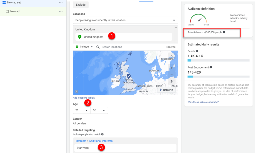 ¿Quieres crear un anuncio dirigido específicamente a personas que viven en el Reino Unido, entre 21 y 55 años, a quienes también les gusta Star Wars?