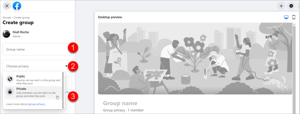 Luego personaliza el grupo con una foto de portada, tu primera publicación, etc.