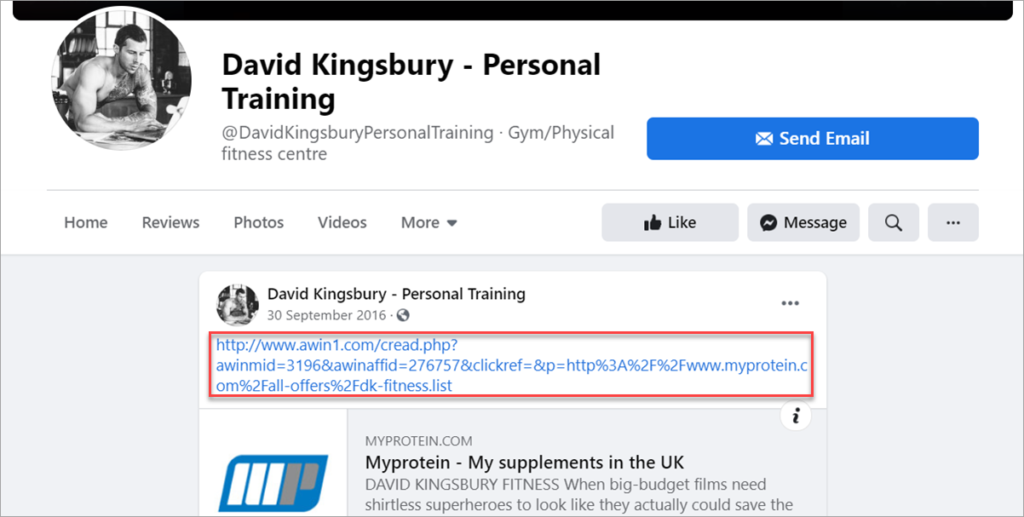 Y finalmente tenemos un entrenador personal que también utiliza enlaces de afiliados en su contenido de Facebook.