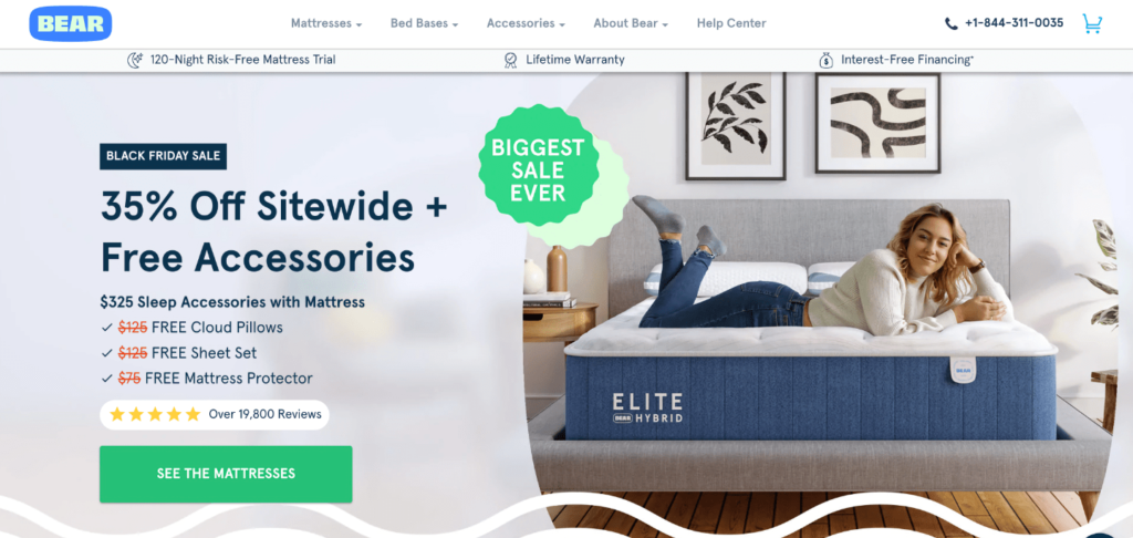 Bear Mattress se especializa en ayudar a los atletas y a quienes llevan un estilo de vida activo a dormir bien por la noche. Sus colchones están fabricados con Sleep Recovery Technology , una mezcla de materiales naturales que ha demostrado ayudar a los clientes a lograr un promedio de 18,3 minutos más de sueño por noche.