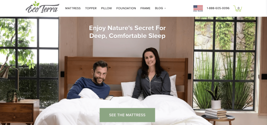 Los colchones de la compañía cuentan con espirales envueltas individualmente con una capa de látex natural de tres pulgadas diseñada para proporcionar transferencia de movimiento cero y reducir los puntos de presión. Todos los colchones Eco Terra están hechos a mano en California, vienen con una prueba de 90 noches y ofrecen envío y devoluciones gratuitas.