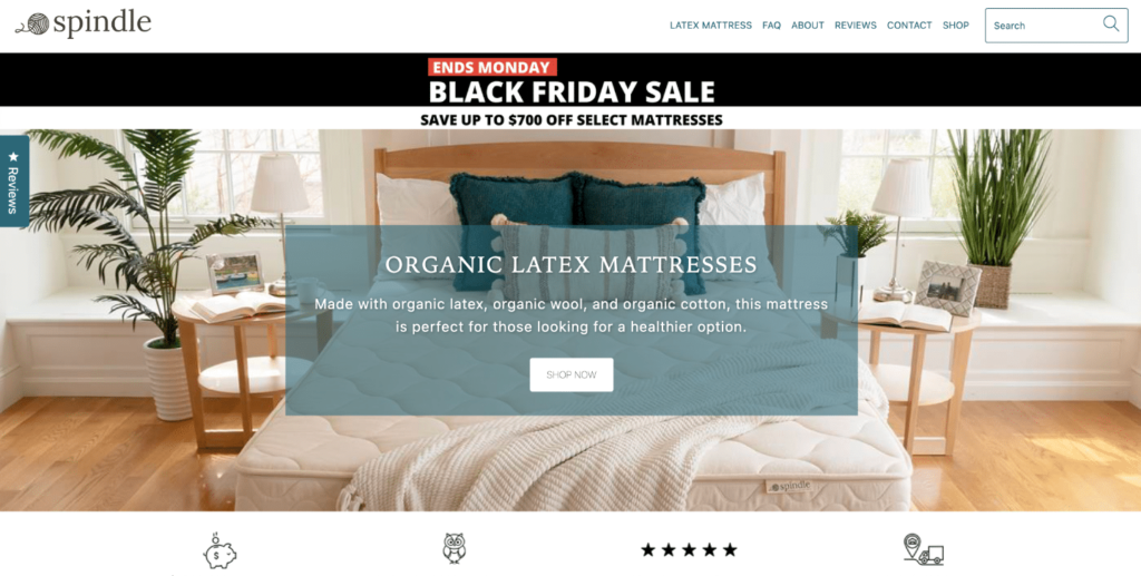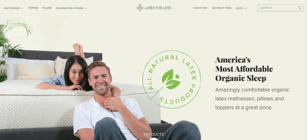 Como sugiere el nombre, Latex for Less vende un colchón de látex totalmente natural y asequible. Sus productos están elaborados con látex 100% natural, algodón orgánico y lana natural proporcionada por agricultores radicados en Estados Unidos.