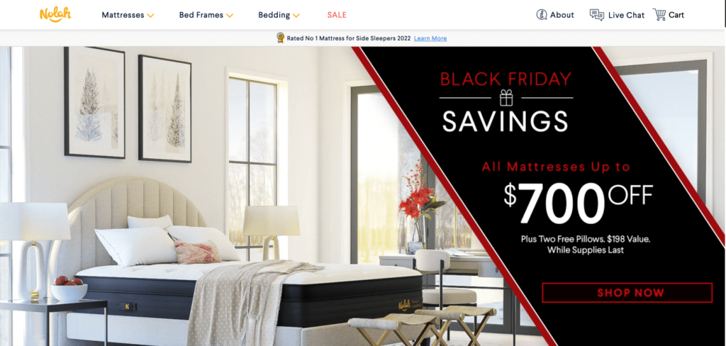 Sus colchones están libres de productos químicos viscoelásticos. Nolah afirma que esto proporciona un alivio de presión 4 veces mejor en caderas, espalda y hombros y, al mismo tiempo, es un 300% más duradero. Los productos Nolah están fabricados 100% en EE. UU. y ofrecen envío gratuito, devoluciones gratuitas y un período de prueba de 120 noches.