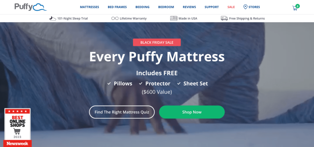 En cuanto a las garantías, la de Puffy es impresionante y dura toda la vida útil del producto. La compañía también ofrece envío gratuito de dos a cinco días a través de FedEx y una prueba de sueño de 101 noches.