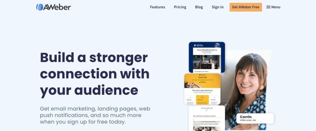 AWeber es… ¿adivinen qué? – otra plataforma de marketing por correo electrónico que también hace muchas otras cosas, como enviar notificaciones push web y ayudar a los clientes a crear páginas de destino de alta calidad. Incluso se incluyen algunas funciones de comercio electrónico por si acaso.