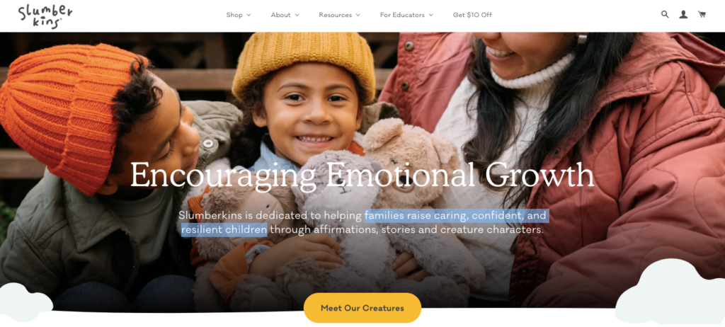 Slumberkins vende libros, juguetes y materiales educativos, y afirmaciones diarias diseñadas para ayudar a los padres a criar niños afectuosos, seguros y resilientes.