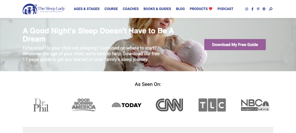 Como sugiere su nombre, The Sleep Lady enseña a los padres cómo ayudar a sus pequeños a disfrutar de un sueño reparador y constante. Ofrece soluciones para recién nacidos, bebés , niños pequeños y niños de hasta seis años. El método Shuffle, marca registrada de la compañía, ha ayudado a más de un millón de familias a beneficiarse de un mejor sueño. Si bien «dormir» está en el nombre del sitio web, también ofrece un curso de entrenamiento para ir al baño en línea.