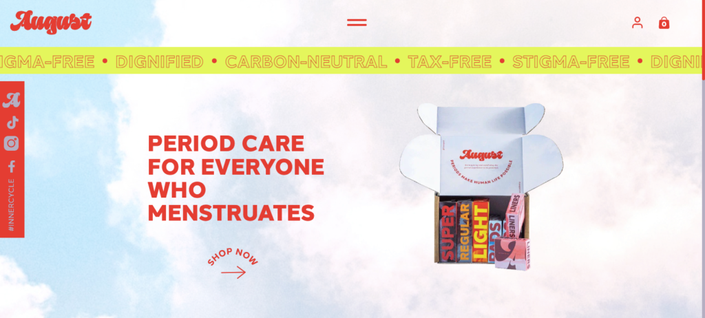 August es una empresa de venta directa al consumidor que vende cajas de suscripción de productos sostenibles para la menstruación, incluidos tampones, toallas sanitarias y protectores. Ofrece envío gratuito en pedidos superiores a $35.