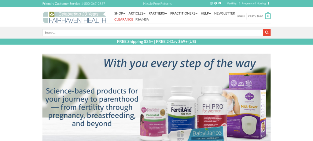 Su gama incluye lubricantes para la fertilidad, discos absorbentes para lactancia y termómetros basales de marcas como Peapod, FertilAid y las filiales de Fairhaven, Milkies y BellyRest. Fairhaven ofrece envío gratuito de primera clase a EE. UU. en pedidos superiores a $35 y envío gratuito de dos días a EE. UU. en pedidos de más de $69.