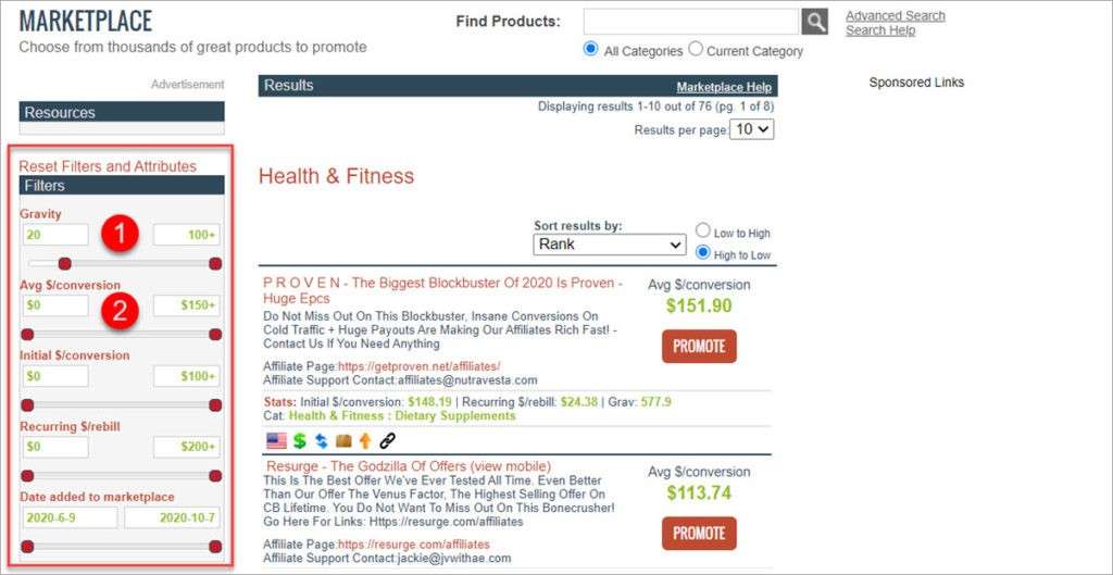 Vale la pena mencionar aquí que la capacidad de ClickBank para ordenar los resultados por ‘Relevancia de las palabras clave’ generalmente cae por un precipicio después de la segunda o tercera página de resultados.