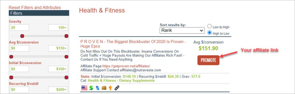 Gravedad : esta es una medida aproximada de qué tan bien convierte un producto afiliado; un número más alto, mejor.