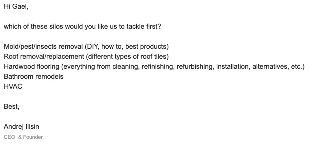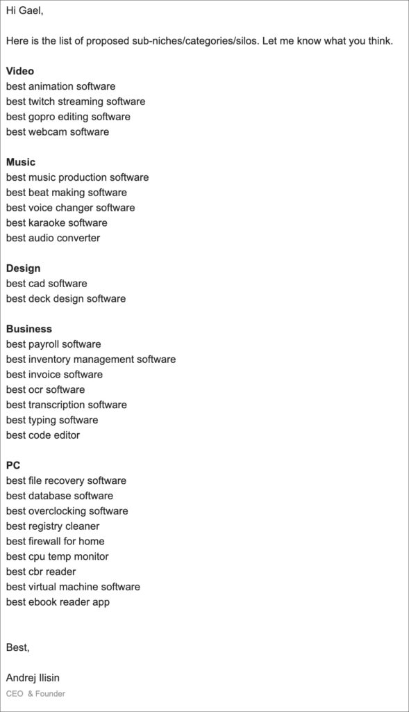 Después de un poco de ida y vuelta, recibo un correo electrónico con estos subnichos potenciales: