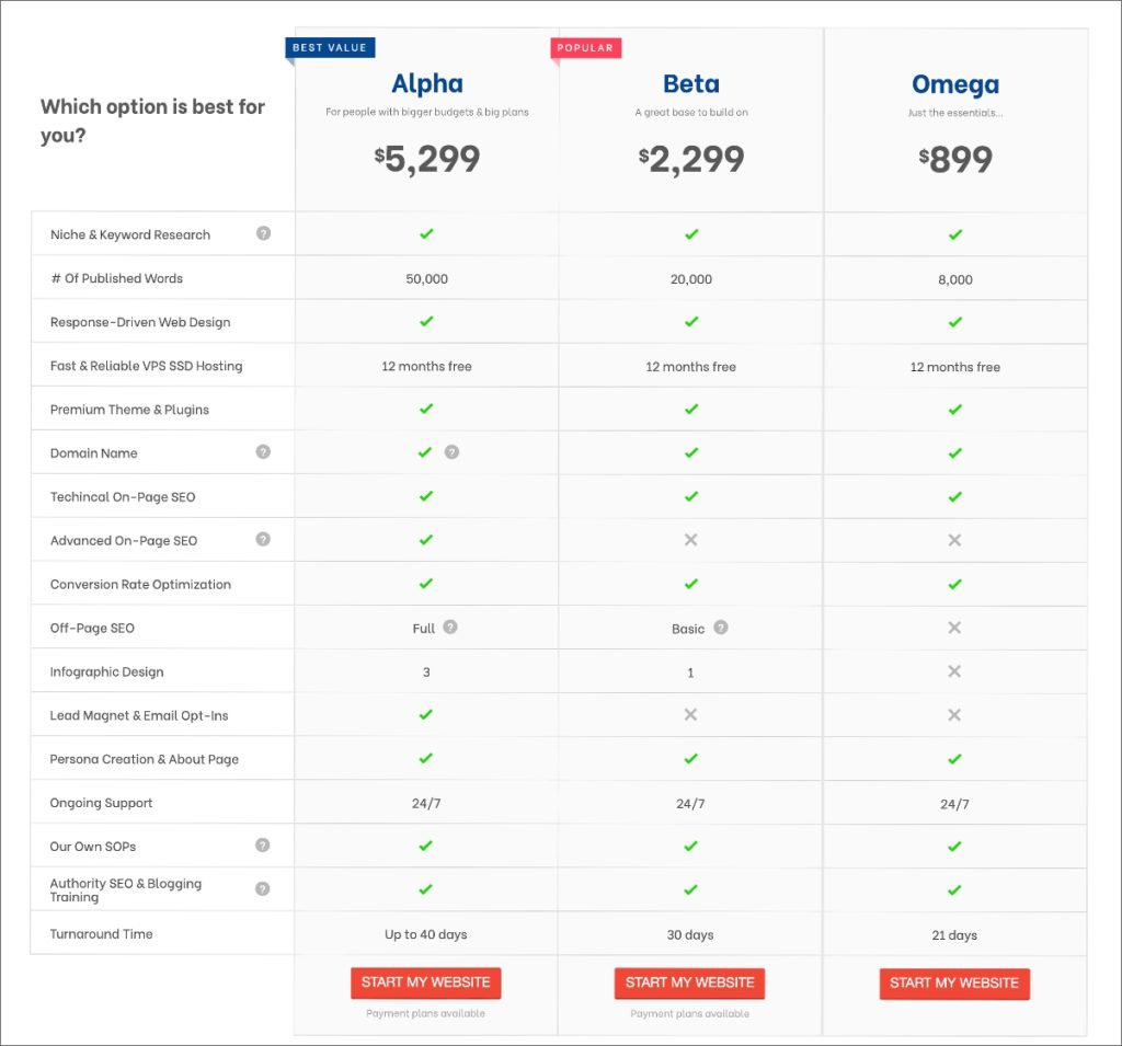 Obtienes 50.000 palabras de contenido, 12 meses de alojamiento, dominio premium, SEO en la página, construcción de enlaces, etc.