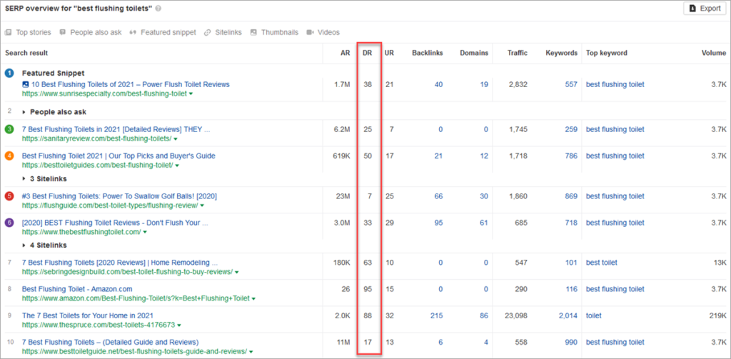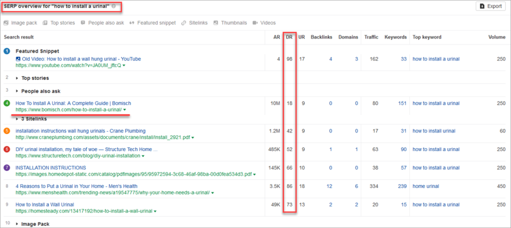 Y sé que podemos clasificarnos en la página número 1 debido a la cantidad de páginas con baja DR en las SERP: