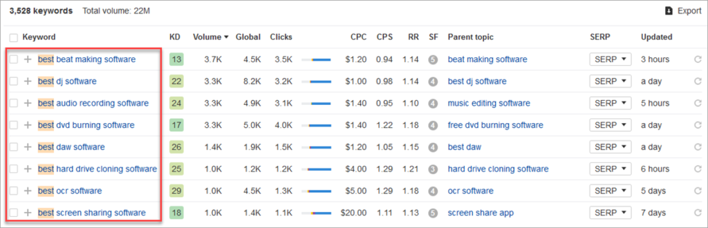 Y luego los subnichos enumerados dentro de ellos, como » mejor software de cambio de voz » y » mejor software de nómina «.