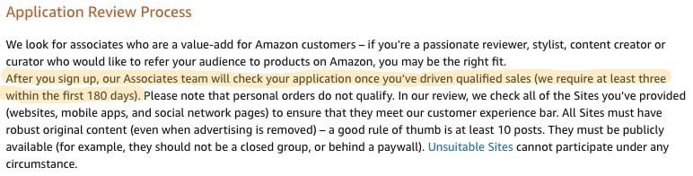 Para ser precisos, debes lograr tres ventas dentro de tus primeros 180 días en el programa Amazon Associates :