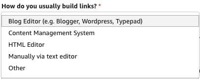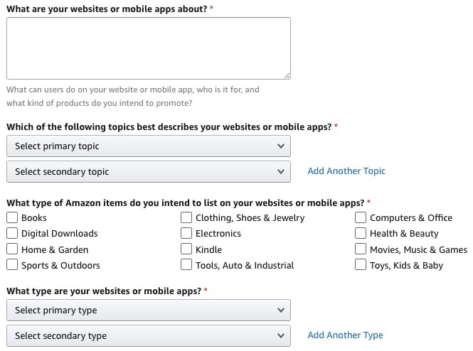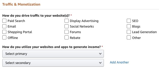 A continuación, Amazon hace una serie de preguntas sobre cómo su sitio web genera tráfico e ingresos de afiliados.