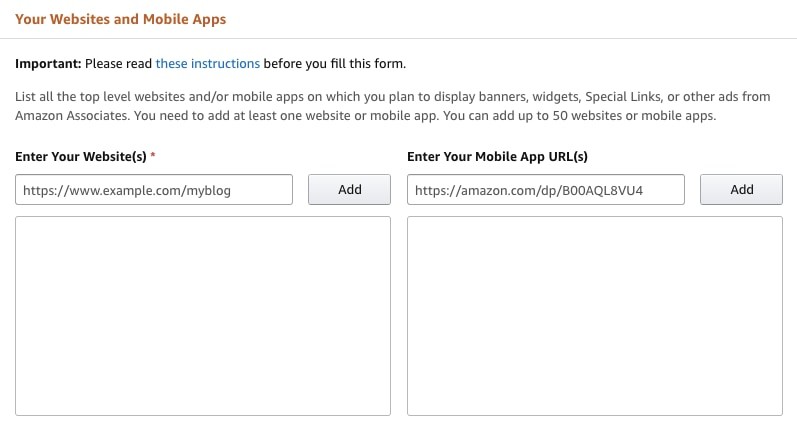 A continuación, es hora de enumerar las “propiedades digitales”, es decir, sitios web y/o aplicaciones, en las que desea anunciar productos a través de Amazon Associates.