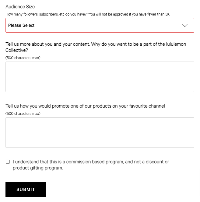 Más allá de estos requisitos técnicos, también deberá proporcionar las URL de todos sus canales de redes sociales y sitios web (públicos y relevantes), explicar por qué desea ser parte del Colectivo Lululemon y discutir cómo planea promocionar. Productos Lululemon.