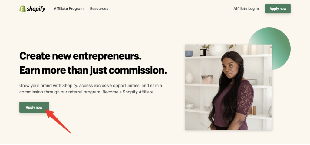 Pulsa el botón Aplicar ahora en la página de inicio de afiliado de Shopify …