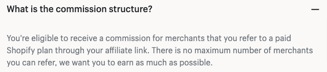 Si lees las preguntas frecuentes en la página de inicio del programa de afiliados de Shopify, encontrarás la siguiente información sobre las tasas de comisión: