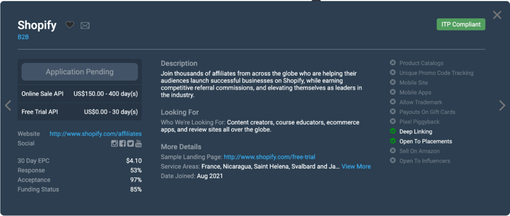 A continuación, también deberás solicitar el programa de afiliados de Shopify. Esto no requiere que respondas más preguntas, pero Shopify revisará tus credenciales y decidirá si encajas bien o no.