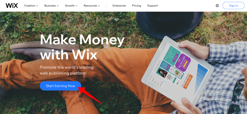 Es un proceso bastante simple. Comience navegando a la página de inicio del afiliado de Wix y presionando el botón marcado «comenzar a ganar ahora»: