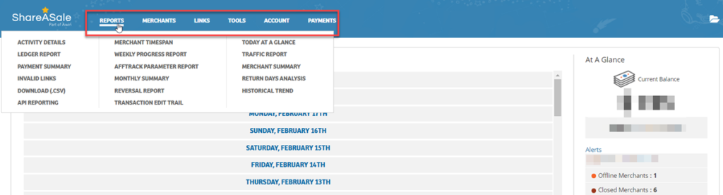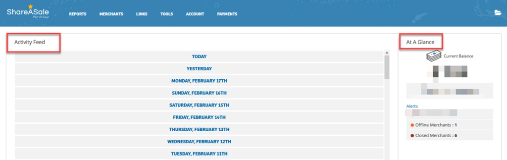 ‘De un vistazo’ muestra su saldo de pago de afiliado actual, cualquier actualización importante para su cuenta ShareASale y los comerciantes que actualmente están fuera de línea o cerrados.