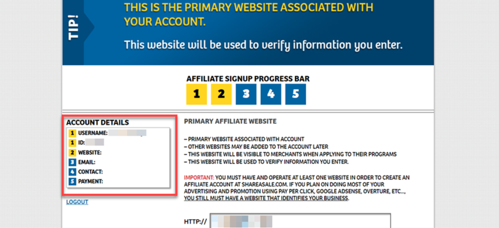#2 Agregue su sitio web afiliado principal: este dominio se usará para verificar su cuenta ShareASale más adelante, así que use un sitio activo.