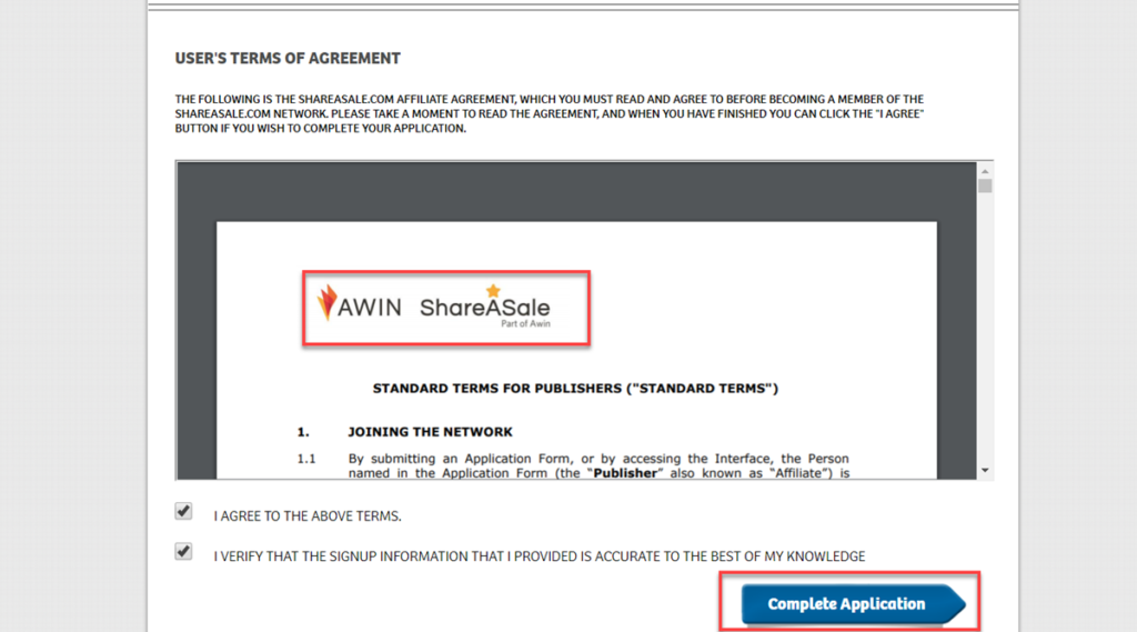 #6 El último paso es aceptar sus términos y condiciones (verá la marca Awin incluida aquí) y luego hacer clic en el correo electrónico de confirmación para enviar su solicitud finalizada para su revisión.
