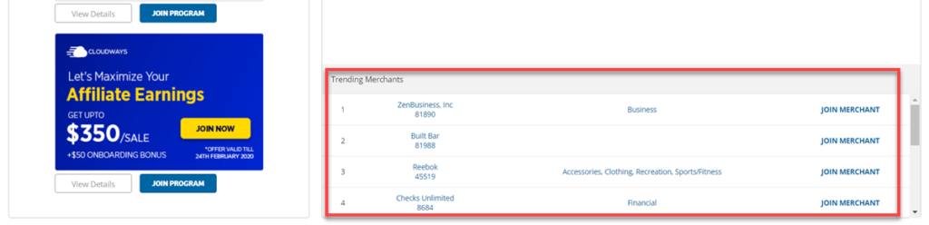 Otro buen detalle es la función ‘Comerciantes de tendencia’: muestra los 10 programas comerciales más populares en ShareASale en su conjunto: