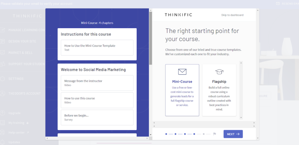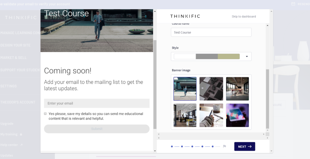 Ni siquiera llegarás al panel antes de que Thinkific te pida que crees un curso.