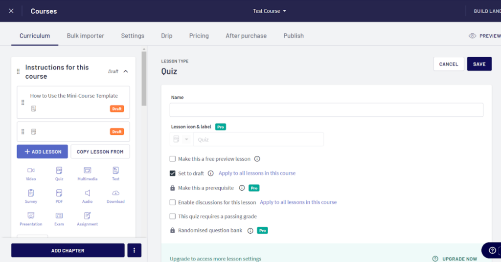 En la pestaña izquierda, también agregará lecciones a su curso.
