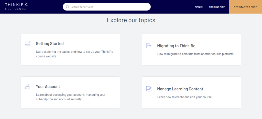 Tiene una estructura clara, con centros de información sobre cómo comenzar, comprender su cuenta, comercializar sus cursos o integrarse con aplicaciones de terceros.
