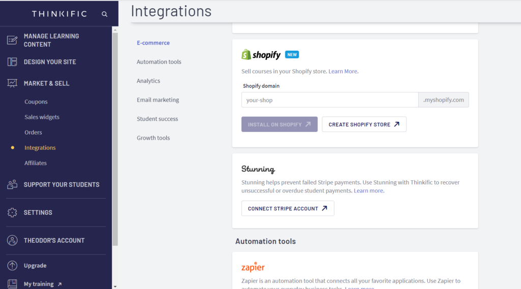 Y si le preocupan las caídas en marketing o ventas, Thinkific ofrece integraciones.