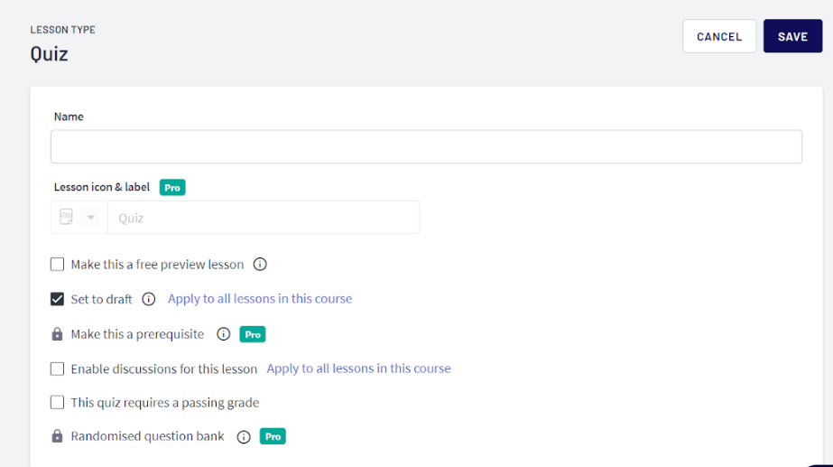 Si elige la plantilla principal, tendrá capítulos, lecciones en video, cuestionarios y soporte de texto.
