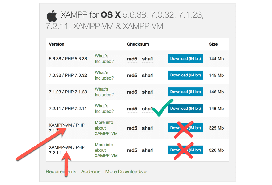 Tenga en cuenta que si elige XAMPP usted mismo, no descargue ninguna versión marcada con una VM. Querrá las versiones enumeradas arriba de esas. No estás configurando una máquina virtual. En cambio, estás armando la cosa real.