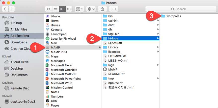 Ahora desea buscar la carpeta MAMP en Aplicaciones y navegar hasta encontrar una llamada htdocs . Ahí es donde vivirá su nueva instalación de WordPress. Simplemente arrastre la carpeta descomprimida a htdocs . De hecho, ahí es donde se almacenarán todos sus archivos web locales.