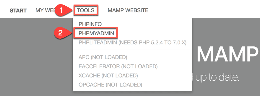 Su navegador se abrirá en la página de ayuda predeterminada de MAMP y verá una barra de herramientas de elementos de menú. Vaya a Herramientas y busque el enlace que dice phpMyAdmin en el menú desplegable.