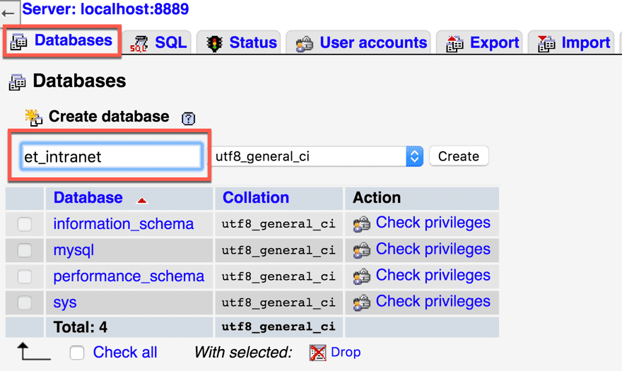 Cuando se carga la nueva página, ves el verdadero corazón de tu instalación de WordPress. La gran mayoría de sus datos vivirán aquí. Haga clic en la pestaña Bases de datos y asigne un nombre a su nueva base de datos en el encabezado Crear base de datos . Elegimos et_intranet . Pulse Crear cuando esté listo.