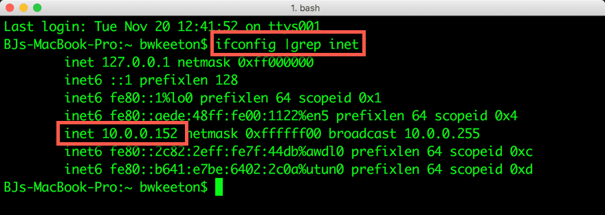 La segunda forma es a través de la línea de comandos. Puede usar la utilidad Terminal para hacer esto. Simplemente ingrese ifconfig |grep inet y presione enter. Sí, ese es el carácter especial de la barra vertical. Gracias OSX Daily por enseñarnos ese comando . Encontrará la dirección IP de su computadora donde dice inet.