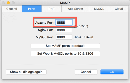 Ahora, desea asegurarse de tener los puertos correctos abiertos para su equipo, así que vaya a las preferencias de MAMP y vea en qué están configurados. De manera predeterminada, es 8888, y está bien usarlo siempre que no haya otras aplicaciones en este servidor local ejecutándose en esos puertos. Si ese es el caso, presione el botón para usar los puertos 80 y 3306.
