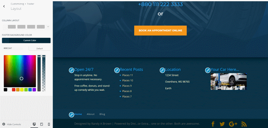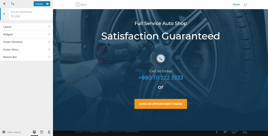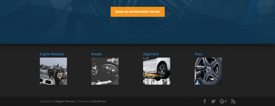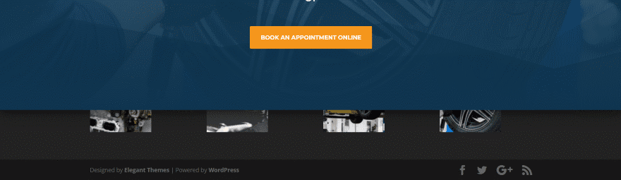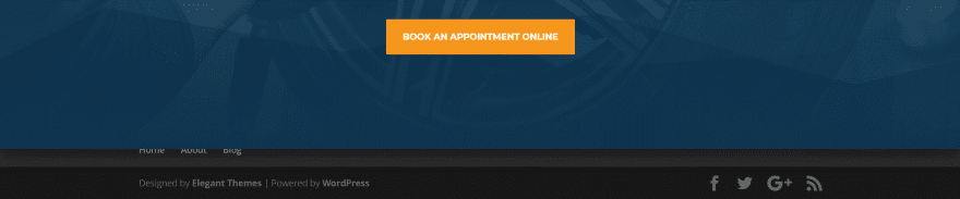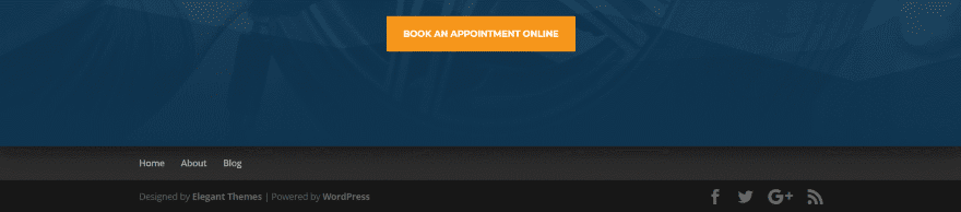 Su área de pie de página mostrará la barra inferior, que incluye el mensaje Diseñado por Elegant Themes | Desarrollado por WordPress, y sus íconos de redes sociales. También mostrará los widgets que haya colocado dentro del área de widgets de pie de página y un menú de pie de página si ha asignado uno. Todo esto se puede personalizar con el personalizador de temas. Puede ver el pie de página que se revela en la imagen de arriba.