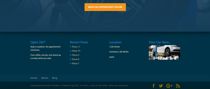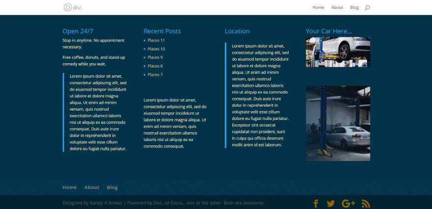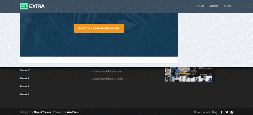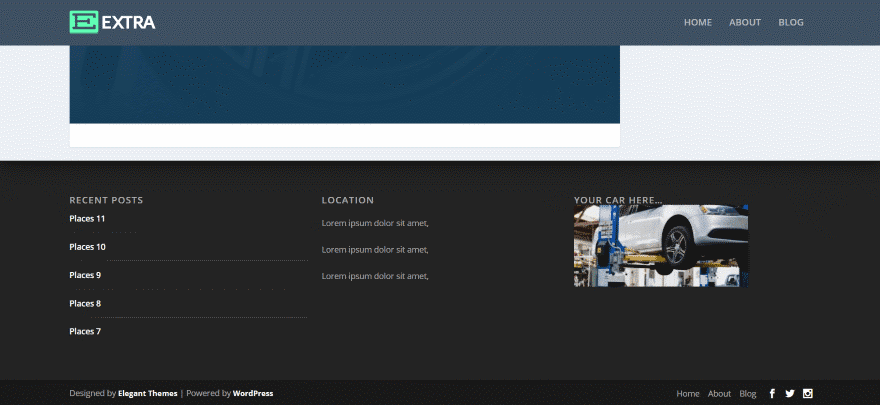Como se prometió, Pie de página revelador para Divi y Extra funciona con Extra. Los elementos del pie de página son diferentes de Divi a Extra, pero el efecto revelador es exactamente el mismo. Extra coloca el menú de pie de página en la esquina inferior derecha y utiliza tres widgets de forma predeterminada. Este ejemplo usa el mismo diseño con una barra lateral.