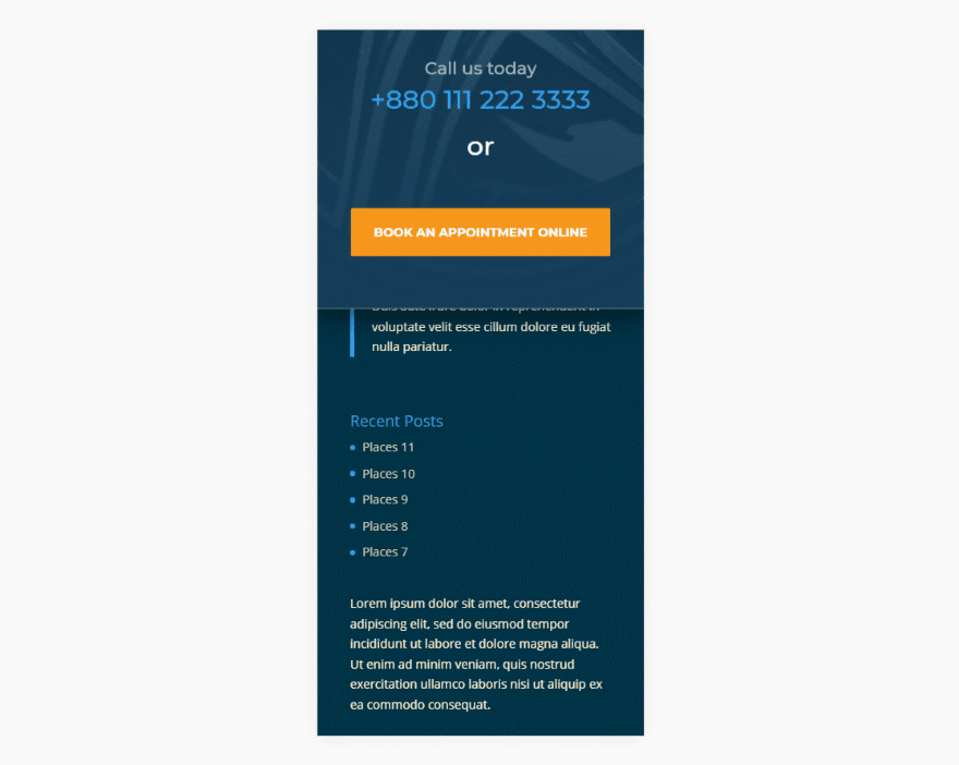 Incluso se adapta a la altura del pie de página. Esto es excelente para pies de página grandes o pies de página que tienen contenido dinámico . En este ejemplo, que usa texto aleatorio solo para ocupar espacio, la sección anterior se ha movido completamente fuera de la pantalla. Al hacer zoom, la sección es visible encima del pie de página.