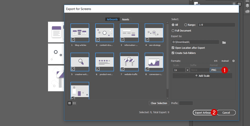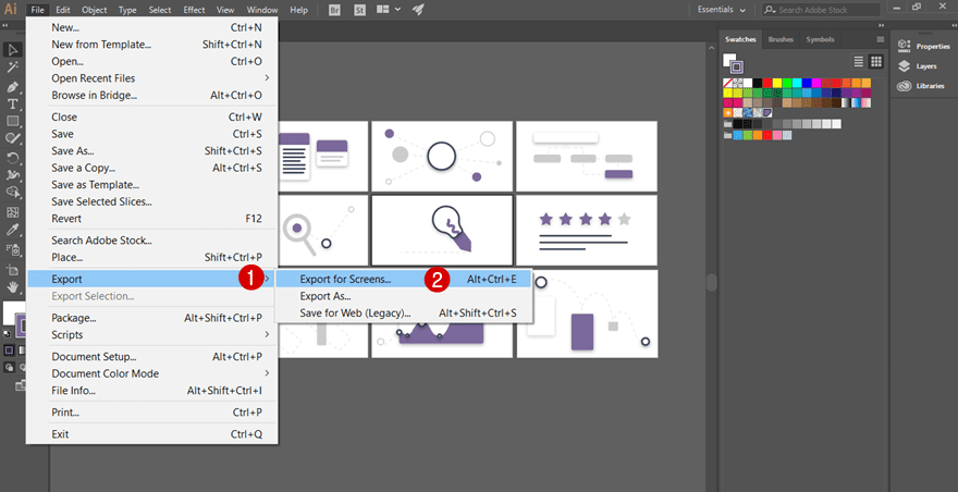 Una vez que haya elegido un color diferente para sus ilustraciones, puede exportar todas las ilustraciones a la vez yendo a Archivo > Exportar > Exportar para pantallas .