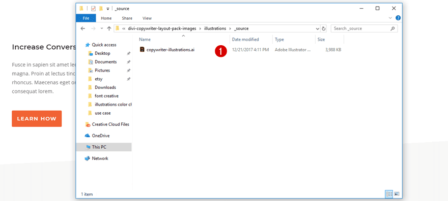 Ahora, vaya a la carpeta descomprimida y localice su archivo de ilustrador yendo a divi-copywriter-layout-pack-images > ilustraciones > fuente .