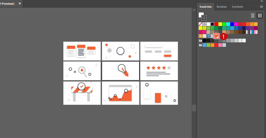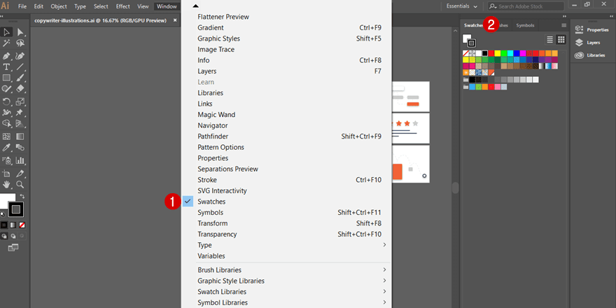 Una vez que haya abierto el archivo de Illustrator, lo primero que deberá hacer es hacer que aparezcan las muestras yendo a Ventana > Habilitar muestras .